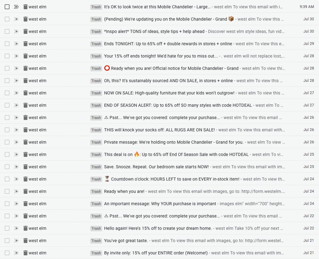 and added a light fixture to my cart. Wanna guess how many marketing emails they sent in the 10 short days before I unsubscribed? TWENTY ONE!